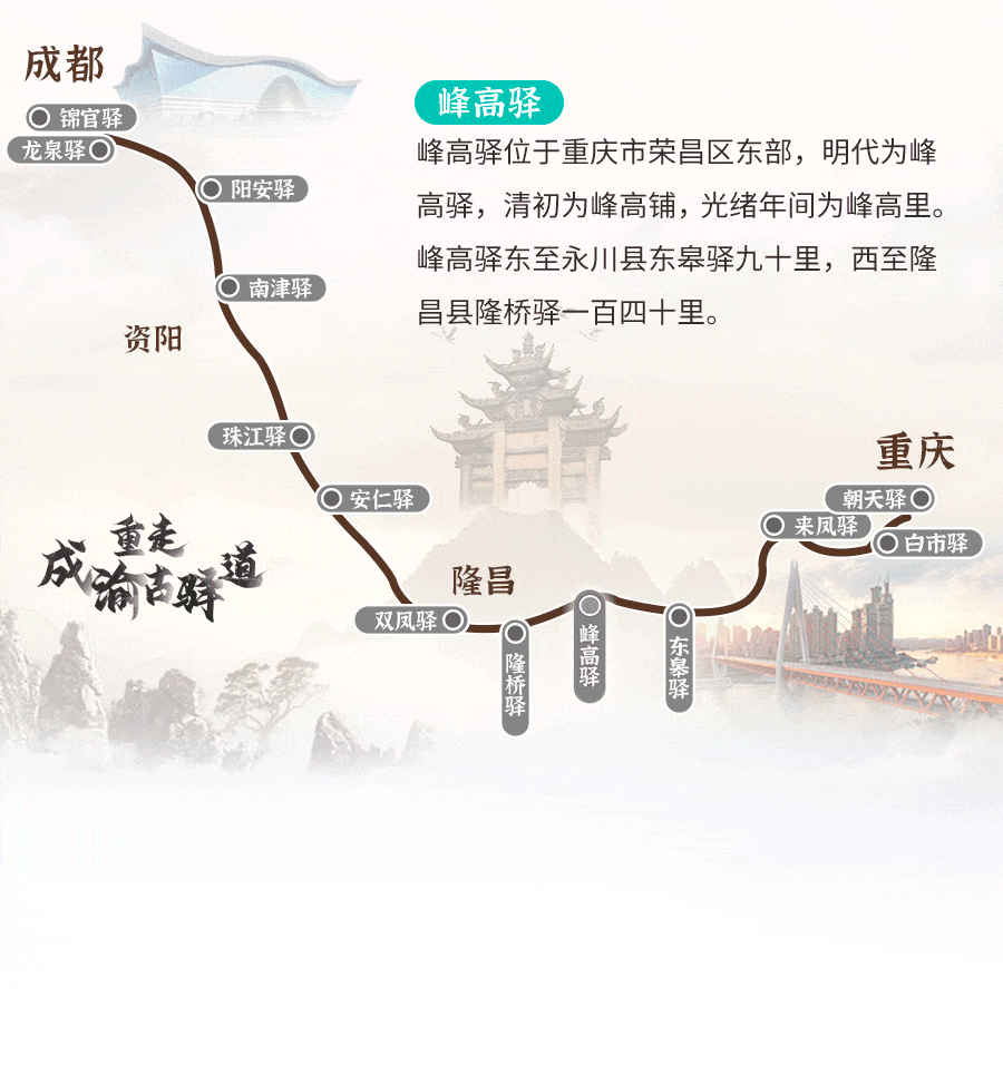 荣昌陶博物馆馆长刘守琪是一位熟悉地方历史的专家。据他介绍,成渝古驿道东大路西段从隆昌、泸县与荣昌县五福乡的蒋家铺进人县境,全长22.5公里。东段由县城底塘铺路出东门打杵坳过沙坝子达离城4公里的板桥场,自板桥街行3.5公里至梧桐铺,又7.5 公里至峰高铺,自峰高铺东行7.5公里至石盘铺,又7.5公里抵大足邮亭铺。 东大路县城东段全程达30公里,路宽1.5-2米,宽敞平直,相向行不须让路。成渝公路荣昌县境段建成通车后,东大路石板多被拆除。