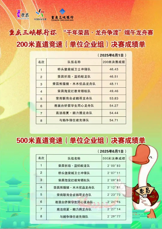 本次比赛设200米、500米直道竞速赛,经过激烈角逐,昌元鹅二爷卤鹅队包揽两个项目镇街组冠军,桥头堡棠城卫士冲锋队、荣昌折扇·蓝焰蛟龙队分获单位企业组200米、500米竞速赛冠军。