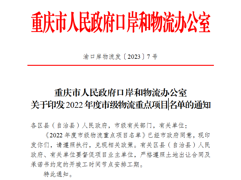 近日,重庆市人民政府口岸和物流办公室公布2022年度市级物流重点项目名单。荣昌共3个项目入选,分别是荣昌综合物流园(川南渝西综合物流园)、重庆荣昌传化公路港物流项目、区级商贸配送中心项目。加上2020年获批的渝西国际商贸物流港,截至目前,我区共有4个市级物流重点项目。