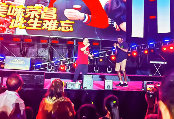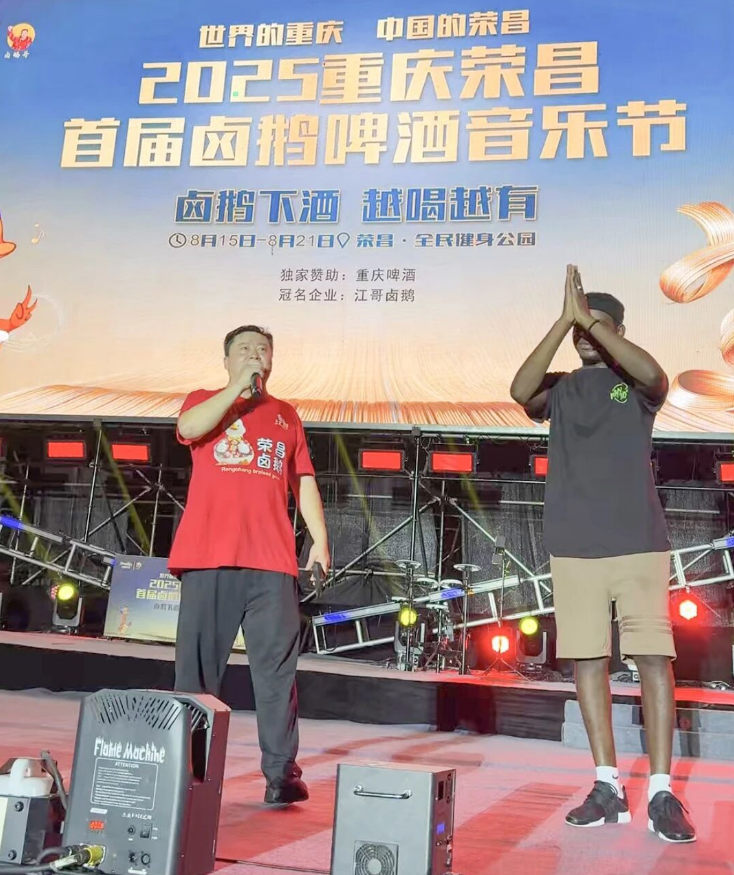 ▲“卤鹅哥”林江(左)在首届卤鹅啤酒音乐节现场倾情献唱。