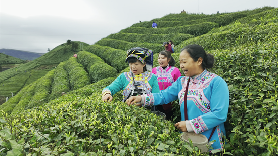 ▲在都匀毛尖核心产区螺丝壳茶山上,茶农一边唱着山歌一边进行春茶采摘。(陈一诺/摄)
