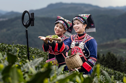 ▲正在直播销售新采都匀毛尖的直播电商。(黔南州农业农村局供图)