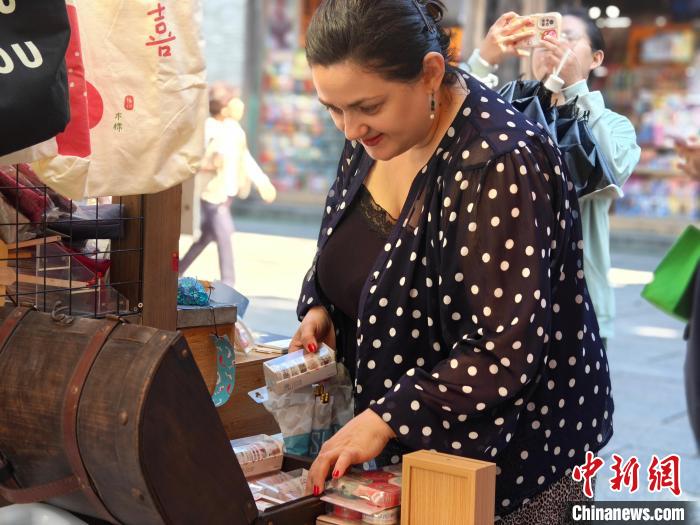 ▲10月29日,格鲁吉亚第比利斯自由大学孔子学院外方院长玛琳娜在福州三坊七巷选购具有福建特色的物品,准备作为礼物带给格鲁吉亚的亲友们。叶秋云 摄