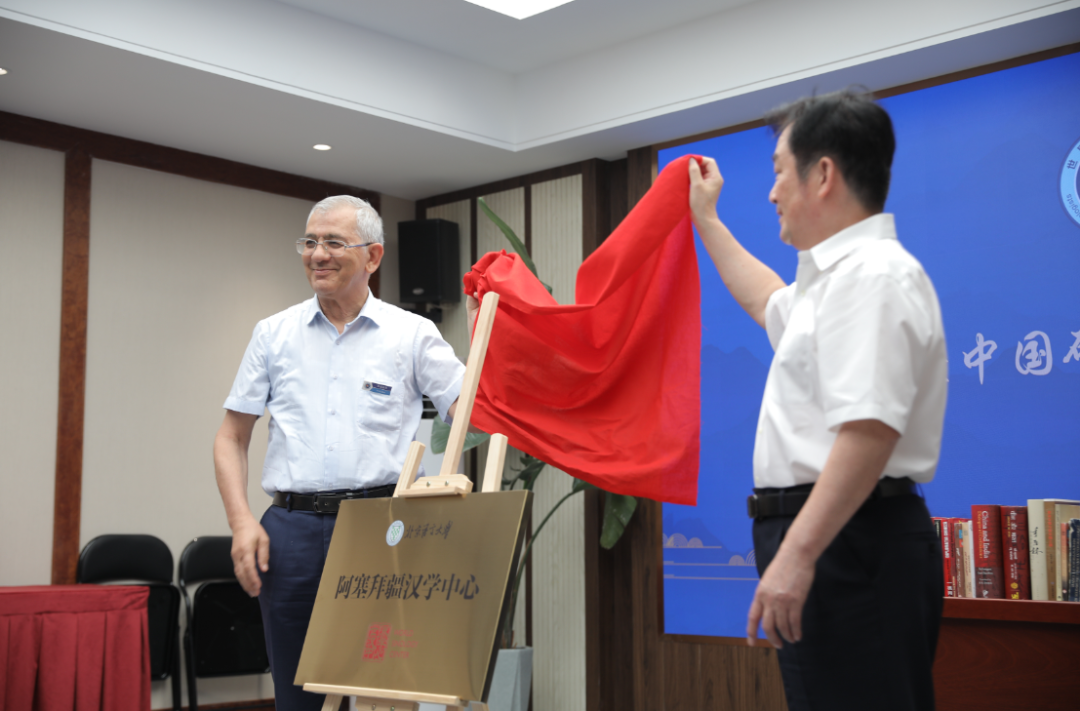 阿塞拜疆卡扎尔大学创始人兼董事会主席哈姆雷特•伊萨汉利与世界汉学中心责任专家孙建华共同为阿塞拜疆汉学中心揭牌。