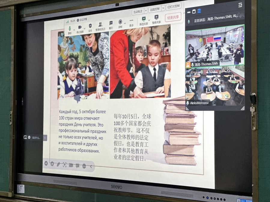 10月19日,在青岛大学双语实验学校线上同步课堂上,俄罗斯彼尔姆第二学校的师生们向我们的孩子介绍了他们所过的教师节——10.05世界教师日。