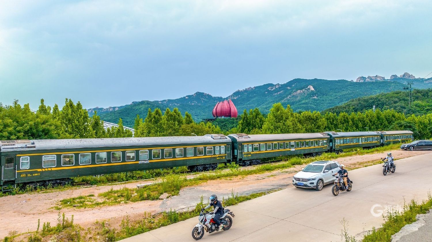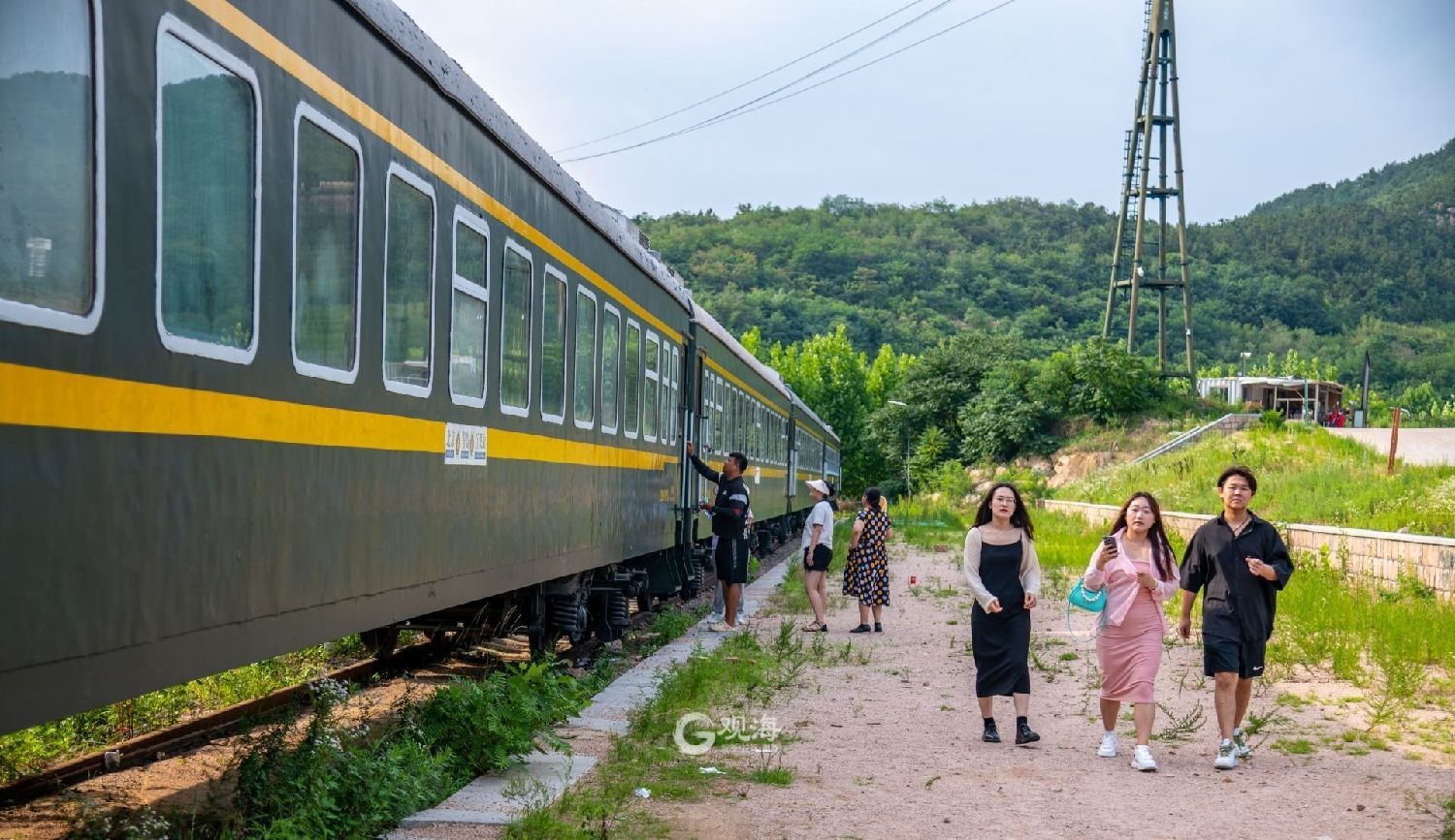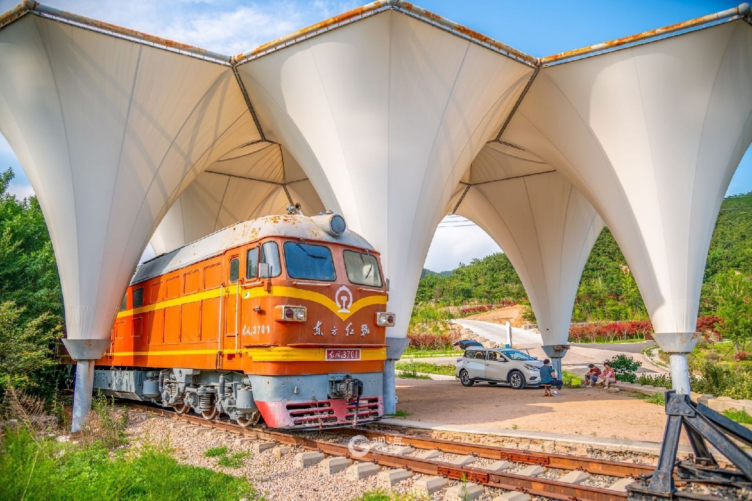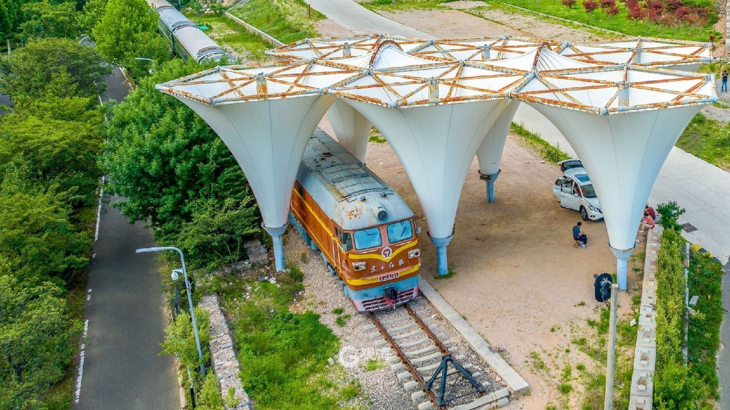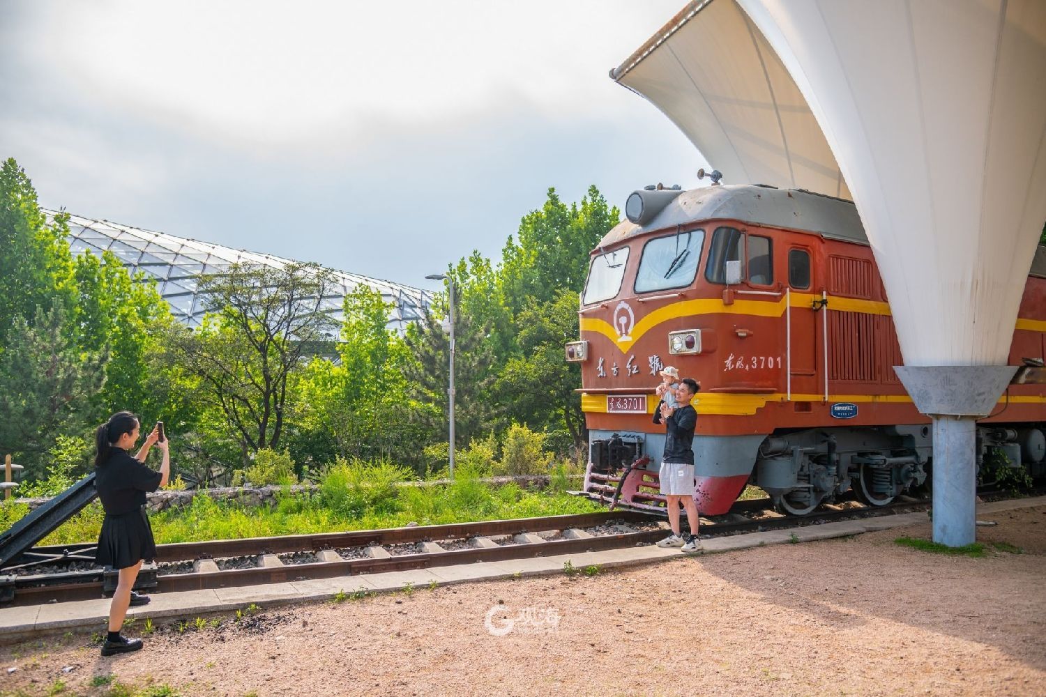 该绿皮火车紧靠青岛世博园,列车如同从森林中驶来。