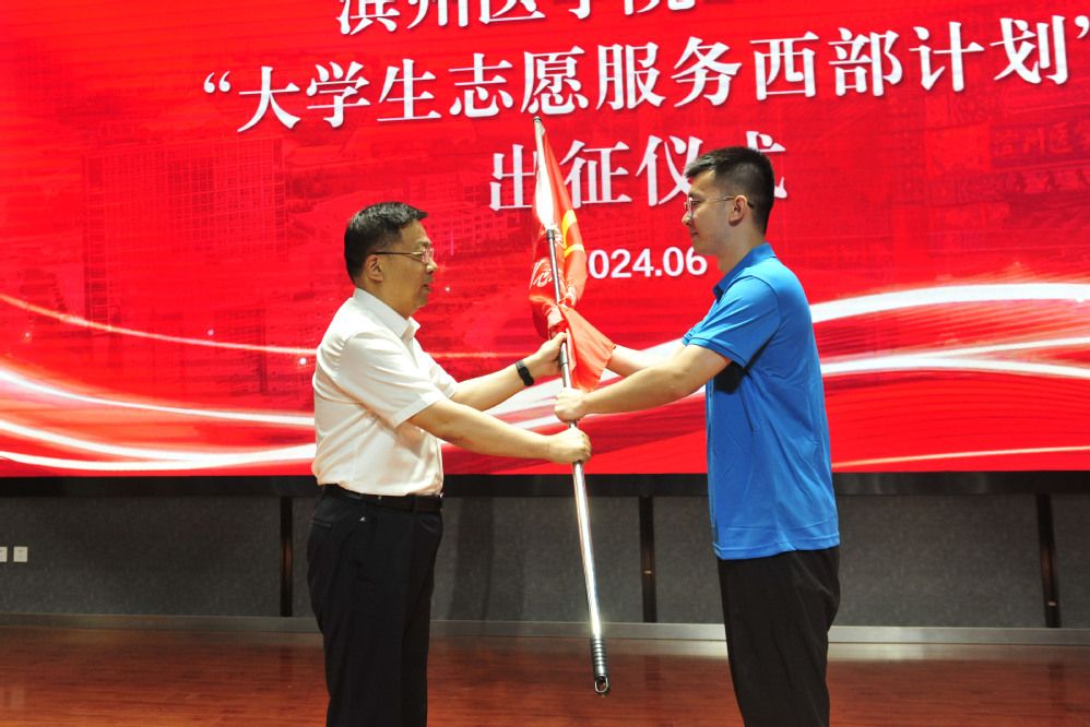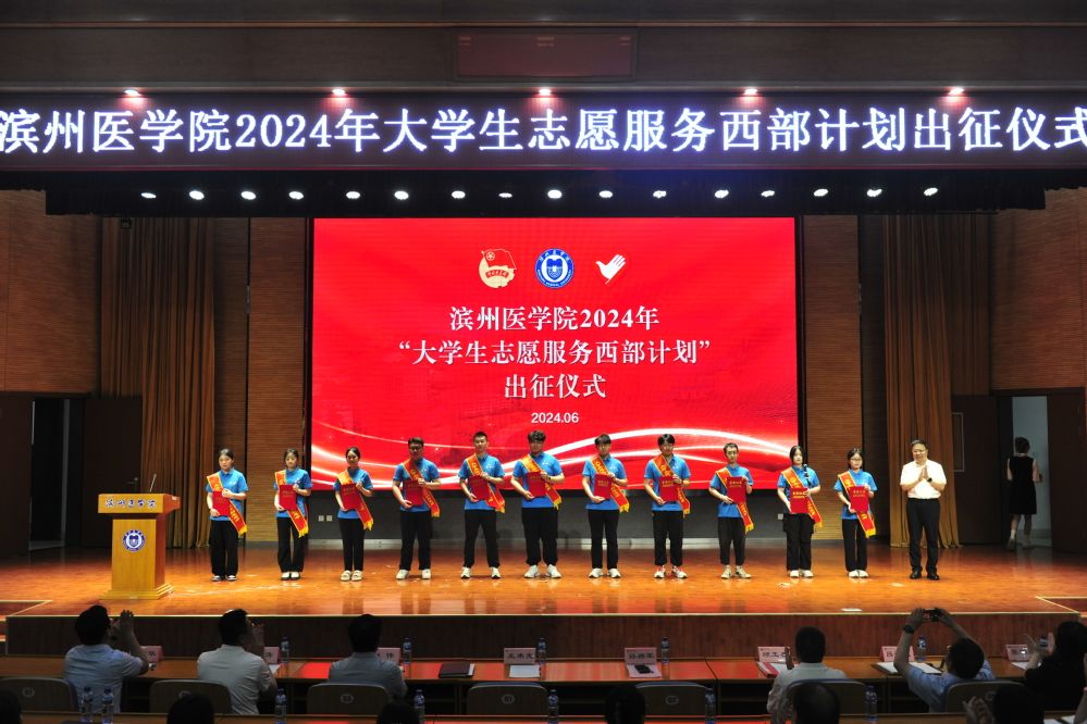 中华民族一家亲,同心共筑中国梦。6月25日,滨州医学院隆重举行2024年大学生志愿服务西部计划出征仪式,为22名“民族团结进步使者”——服务西部大学生志愿者壮行。党委书记孙祥军出席仪式,为志愿者授旗,佩戴绶带,颁发荣誉证书,提出希望和要求。
