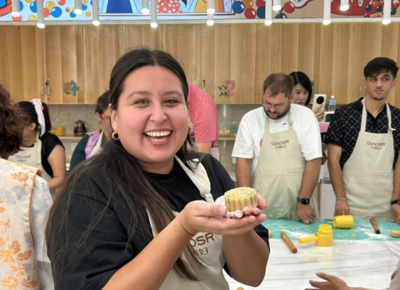 “看我做的!”智利籍学生Connie举着刚脱模的月饼说,原本以为做月饼很难,可大家一起动手、互相帮忙,反倒觉得特别温暖,“制作月饼是一个充满分享精神的过程,我喜欢这种大家一起动手、一起分享的感觉,非常美妙”。