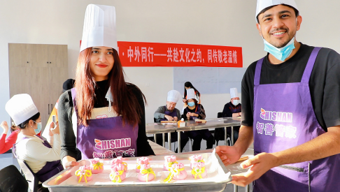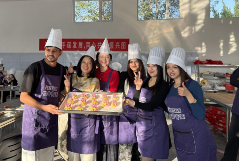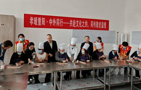 活动中,国际友人与烟台家庭代表在烟台智善职业培训学校制作了胶东大饽饽,并前往朱柳村党群服务中心长者食堂现场向老人赠送饽饽。
