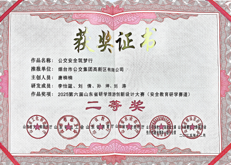 由山东省文化和旅游厅、省总工会、教育厅、农业农村厅、省绿色低碳高质量发展先行区建设领导小组办公室及省精品旅游促进会共同联合主办的“2025第六届山东省研学旅游创新设计大赛”落下帷幕,烟台公交集团高新区有限公司申报的《公交安全筑梦行》研学课程,凭借鲜明的特色、扎实的内容与创新的设计,经层层评审,最终荣获大赛“安全教育研学赛道”二等奖!