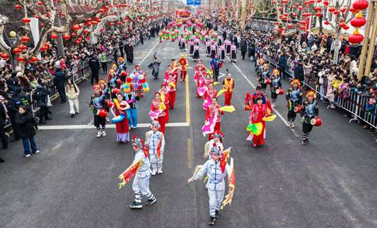 “隆咚隆咚锵……”上午9点,伴随着铿锵有力的锣鼓声,表演方阵组成的巡演长龙昂扬行进,大秧歌、抬花轿、踩高跷、舞龙舞狮……各类节目轮番上演,令人目不暇接。表演者们身着色彩艳丽的特色服饰,手持各式表演道具,脸上洋溢着灿烂喜悦的笑容,舞出了老百姓对新一年的美好向往与期待。跑旱船、骑毛驴、丑婆进城等趣味民俗节目诙谐幽默,表演者们夸张逗趣的造型和动作极具感染力。