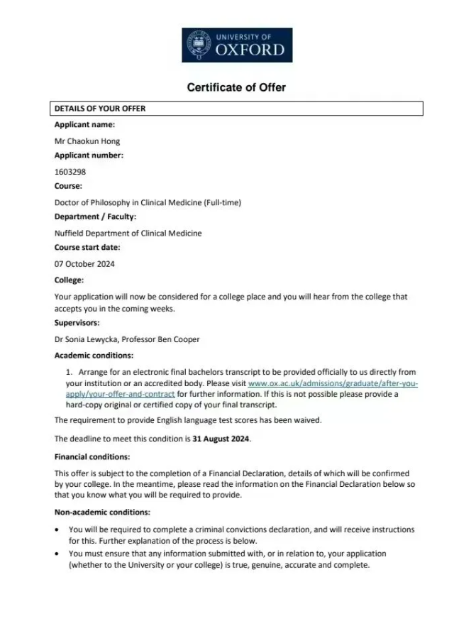 牛津大学博士录取通知书