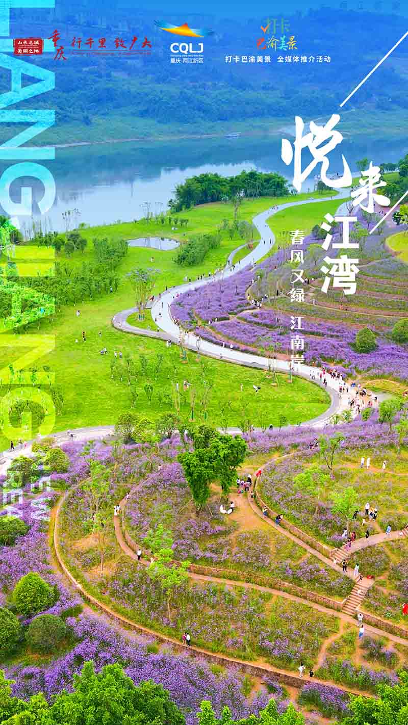 在悦来江湾,山水相依,灵动秀美。漫山马鞭草汇成一个浪漫的紫色梦境,花、城与江面相映成趣,构成一幅美丽的春色画卷。