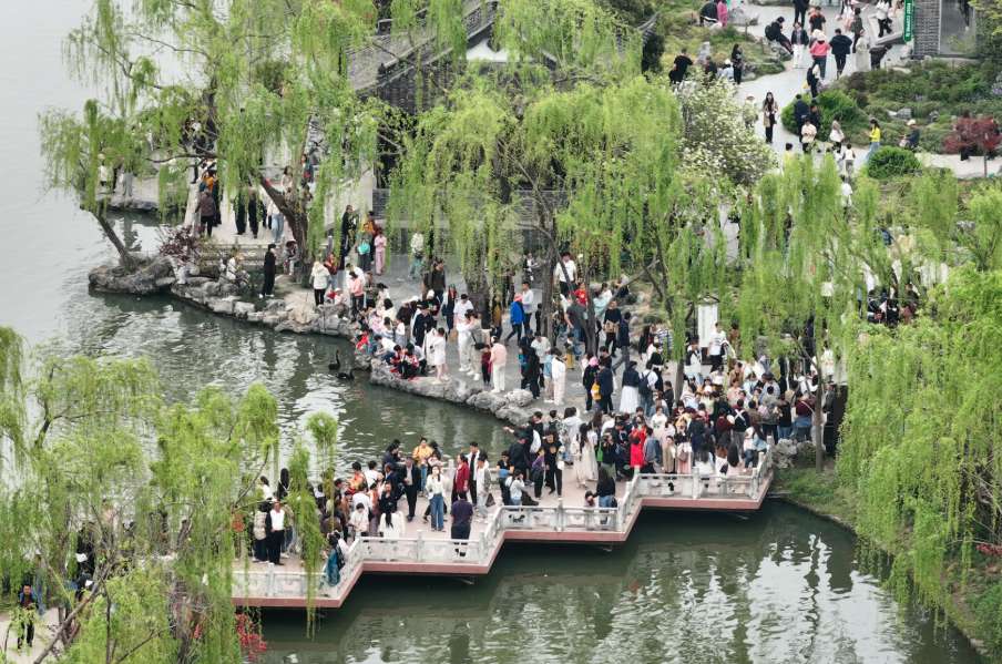 ▲2025年4月4日,游客们在江苏扬州瘦西湖景区内游玩。(无人机照片)(图片来自中新社)