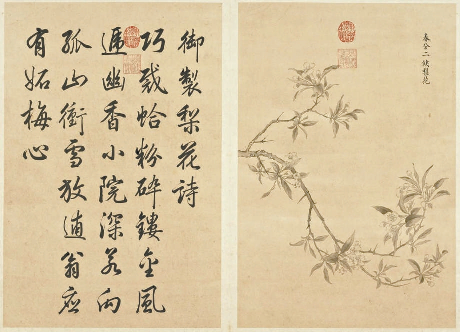 依照张若霭的青绿山水小品可见,“梨花伴月”曾经是一座依山势而建的三级台地式院落,门口挂有康熙手书“梨花伴月”匾额。院内遍植梨花,乾隆时期又新增游廊,经常在此读书喝茶,意境清净悠远。此院落如今已经不复存在,但此景仍被清晰记录在册。遥想乾隆年间某个暮春清夜,月升当空,乾隆帝携书画爱臣梁诗正、董邦达、庄有恭、余省等漫步梨花林下,但见月光银白、琼花飞落,乾隆随即好诗脱口而出:“巧裁蛤粉碎镂金,风递幽香小院深。若向孤山冲雪放,逋翁应有妒梅心。”余省用工笔勾勒出一条下垂梨花枝,右上角写“春分二候梨花”,庄有恭在对页以行书书写了这首御制梨花诗。庄有恭书法用笔精到、率真闲适,古雅中散发着萧散之气。诗中说梨花花瓣荧白、花蕊金黄,阵阵香风绕院落送到跟前,如果林逋看到漫山梨花如雪,估计也想要在孤山改种梨花吧?