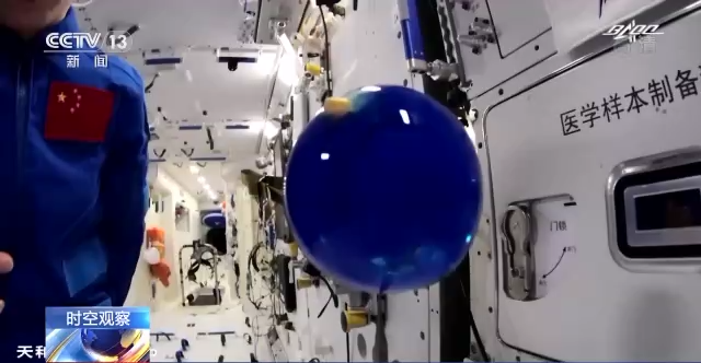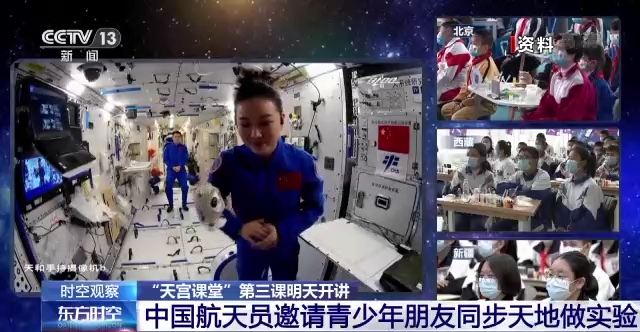 授课中,航天员介绍展示了空间站工作生活场景,演示了微重力环境下细胞学实验、人体运动、液体表面张力等神奇现象,并讲解了实验背后的科学原理。