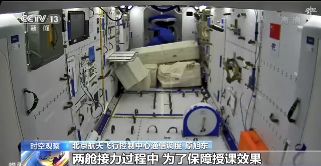北京航天飞行控制中心通信调度原旭东:我们采用了问天舱和天和舱两舱切换跟踪的模式,每个舱都可以下传同样的摄像机(图像),包括话音。通过两舱的话音级联、图像下传,确保整个(太空授课)图像话音流畅。两舱接力过程中,为了保障授课效果,我们也是精心设计,再结合授课脚本进行图像话音切换。