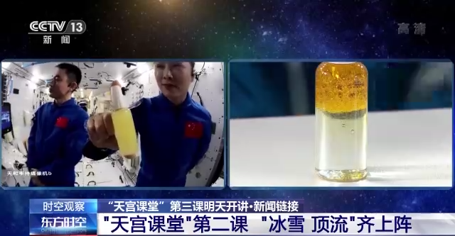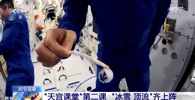 在约45分钟的授课中,航天员演示了微重力环境下太空“冰雪”实验、液桥演示实验、水油分离实验、太空抛物实验,讲解了实验现象背后的科学原理,还展示了部分空间科学设施。