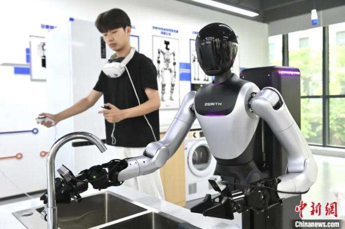 ▲2025年6月19日,在合肥市具身智能机器人数据采集预训练场内,人形机器人正在进行“岗前实训”。图为工作人员正在训练人形机器人。中新社记者 韩苏原 摄