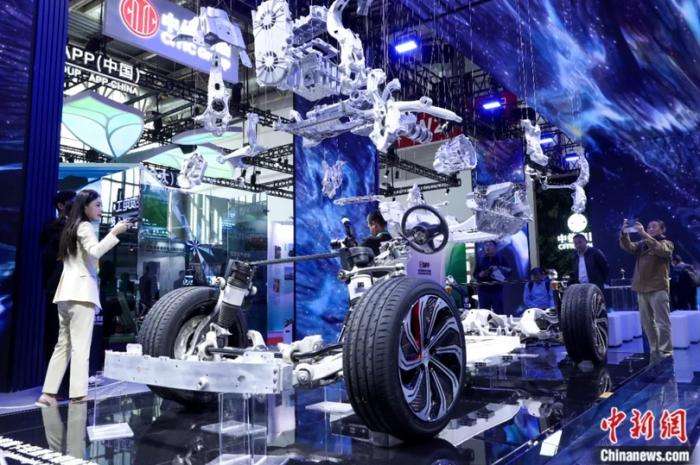 ▲2024年11月26日,主题为“链接世界,共创未来”的第二届中国国际供应链促进博览会在北京开幕。图为先进制造链展馆,嘉宾在中信集团展厅参观汽车零部件一体化方案。中新社记者 张祥毅 摄