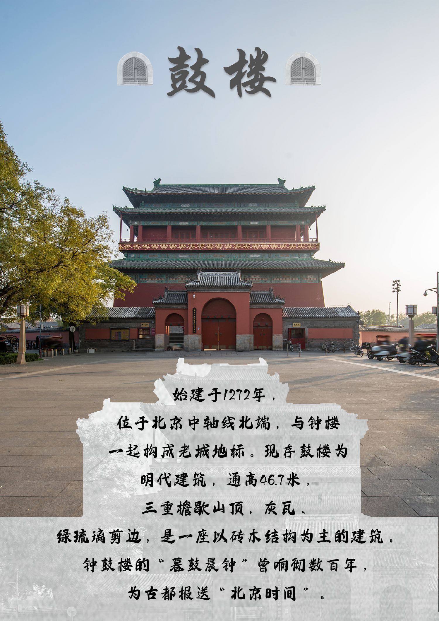 北京钟鼓楼是全国现存钟鼓楼中保护最为完好、体量最大、报时器具最具规模的一组古代建筑。“暮鼓晨钟”是北京人对老北京最深的记忆之一。作为元、明、清三代都城的报时中心,钟鼓楼的“暮鼓晨钟”曾响彻数百年,敲出了古老北京城的“标准时间”。它们用声音一早一晚来管理人们的起居生活,号令全城百姓日出而作,日落而息,体现了人类对自然规律的尊重和顺应。
