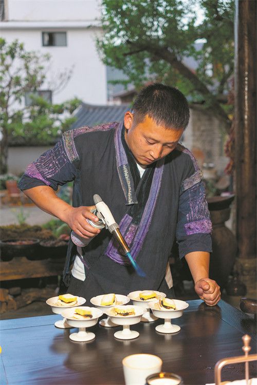 ▲Wu Tao makes a dish using local materials at his restaurant in Lijiang, Yunnan province. (China Daily)