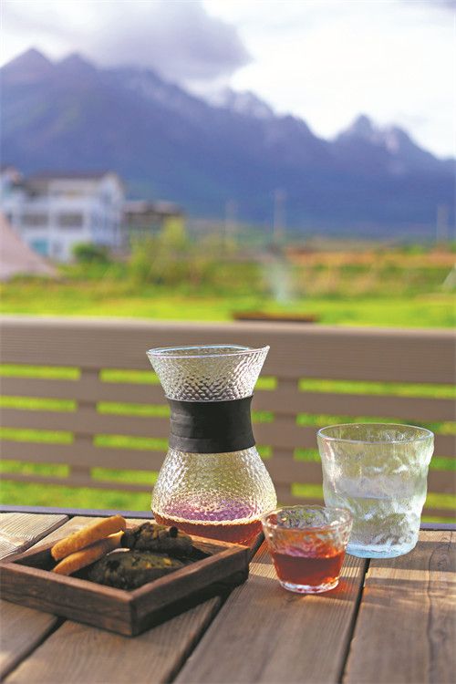 We visited Xundoushi Coffee Manor in Baisha ancient town. The cafe is situated on grassland and features a wooden structure that reflects the local architectural style. Guests can rest in outdoor tents on the lawn and enjoy their coffee while taking in the distant Jade Dragon Snow Mountain.