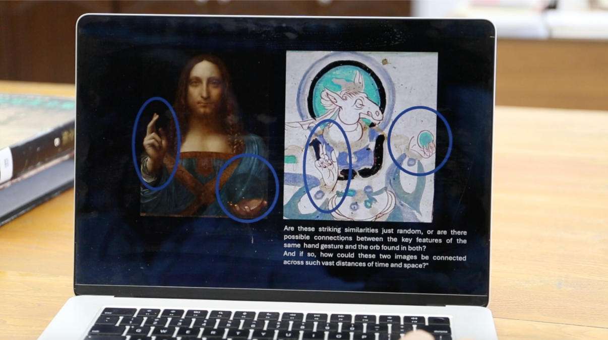 ▲2025年8月8日,史瀚文展示莫高窟第25窟的新发现,该壁画主人公肢体动作与达·芬奇的《救世主》如出一辙,但又早了500多年。中新社记者高莹 摄