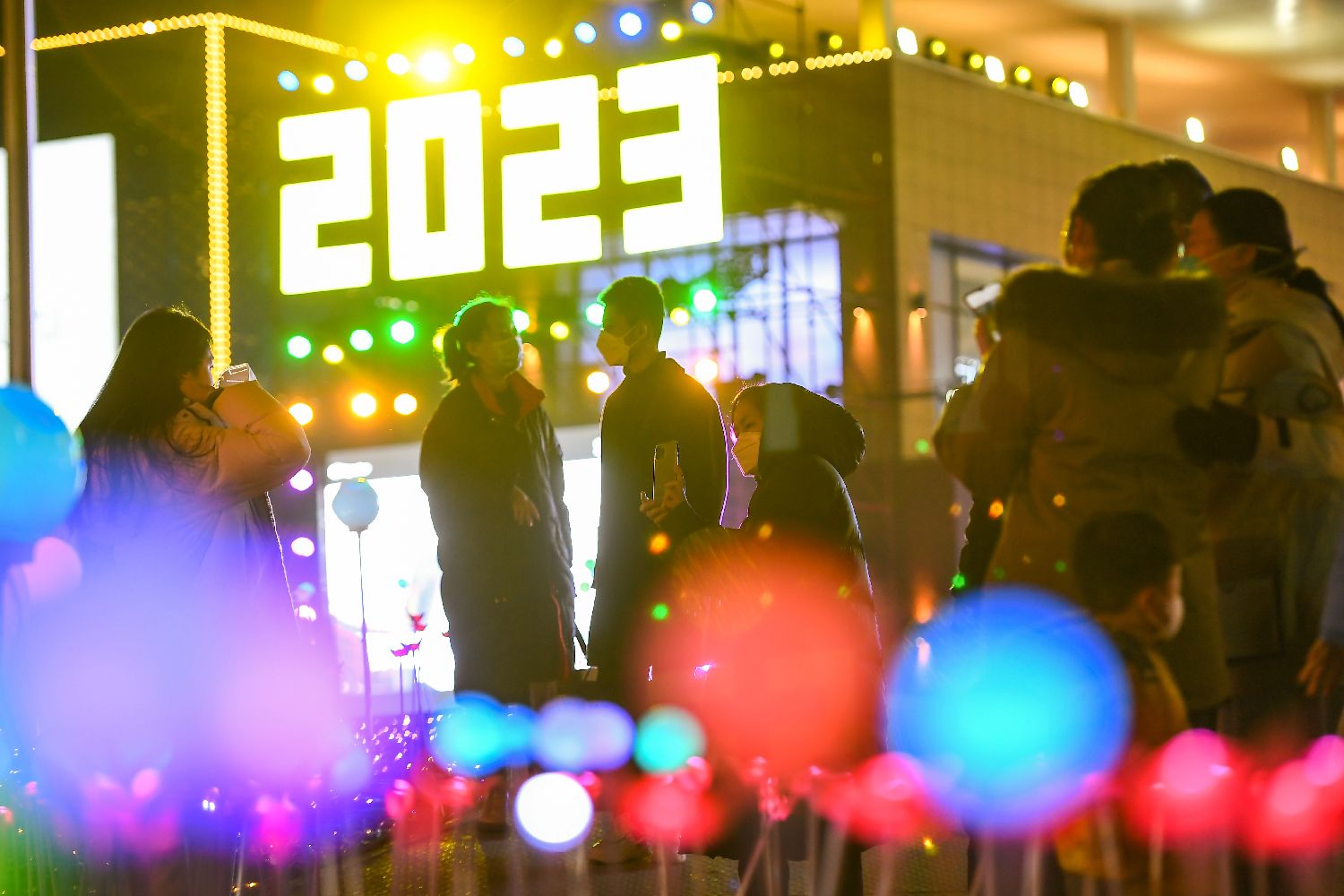 ▲12月31日晚,山西晋中一商场举行跨年灯光节,民众赏灯拍照留念,度过2022年的最后一天。(图片来自中新社 武俊杰摄)