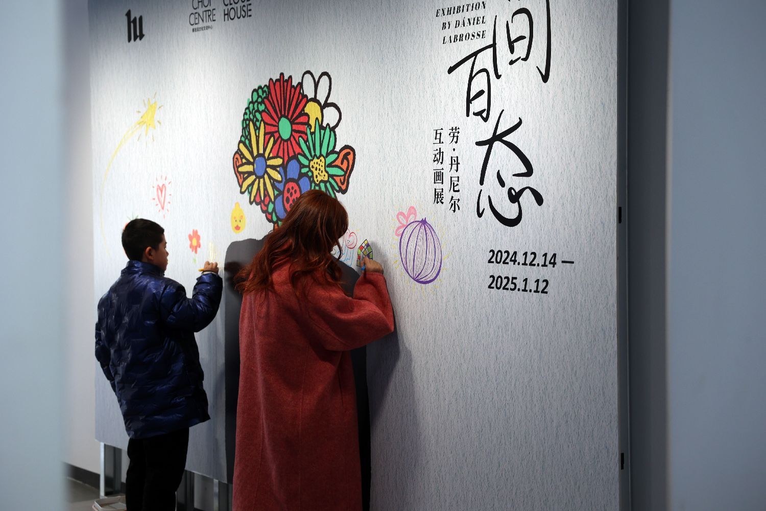 2024年12月14日,参与活动开幕式的嘉宾在展板上绘画。当日,匈牙利视觉艺术家劳·丹尼尔(Labrosse Dániel)的展览《世间百态》在北京蔡冠深文化交流中心白云馆开幕。此次展出的画作不仅涵盖了描绘普通人公寓日常生活的系列画作、风格鲜明的个人肖像,还精心挑选了展现布达佩斯繁华街景、地铁一隅等富含匈牙利文化的佳作。(图片来源:本文图片均由李大鹏摄)