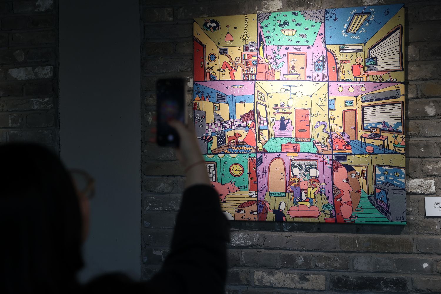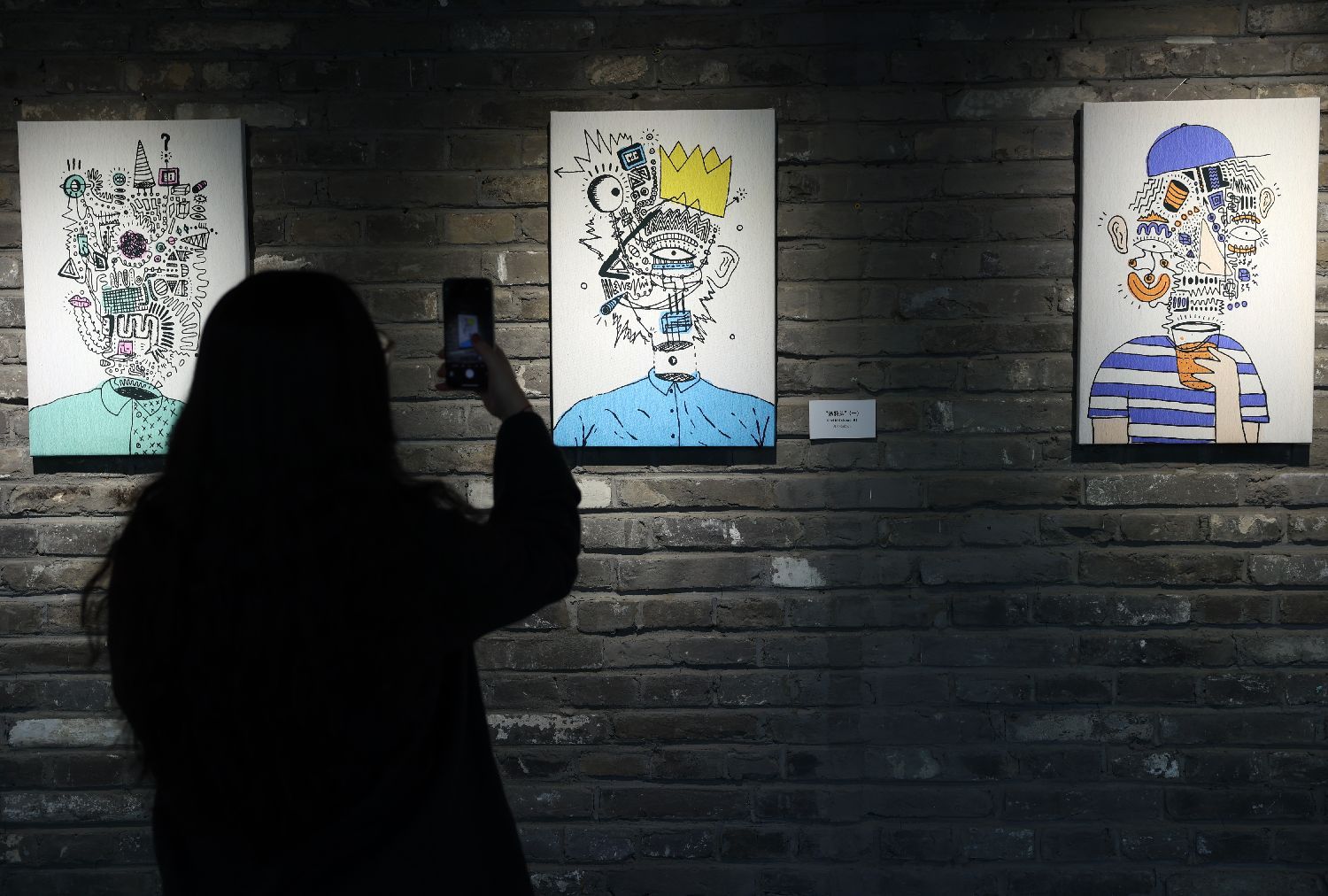 ▲14日,现场展出的《涂鸦头》系列画作吸引参观者驻足拍摄。