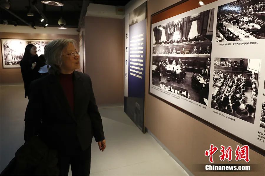 ▲远东国际军事法庭中国法官梅汝璈之女梅小侃参观专题《正义的审判——纪念东京审判宣判71周年专题展》。富田 摄