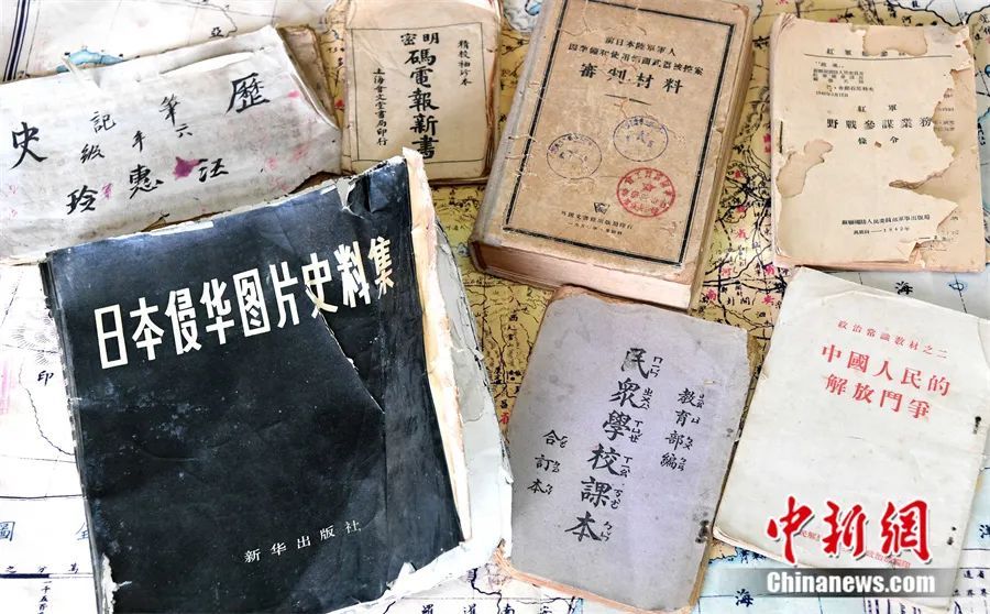 ▲《日本侵华图片史料集》等文献书籍。刘可耕 摄