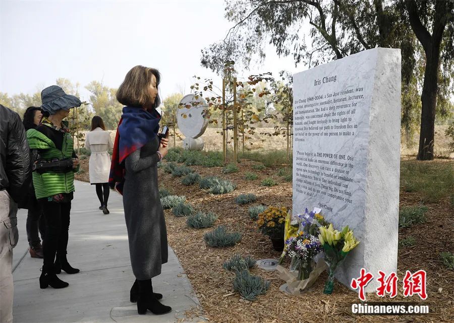 ▲“张纯如公园”在美国圣荷西揭幕,人们向刻有张纯如生平简介的纪念碑献花。刘关关 摄