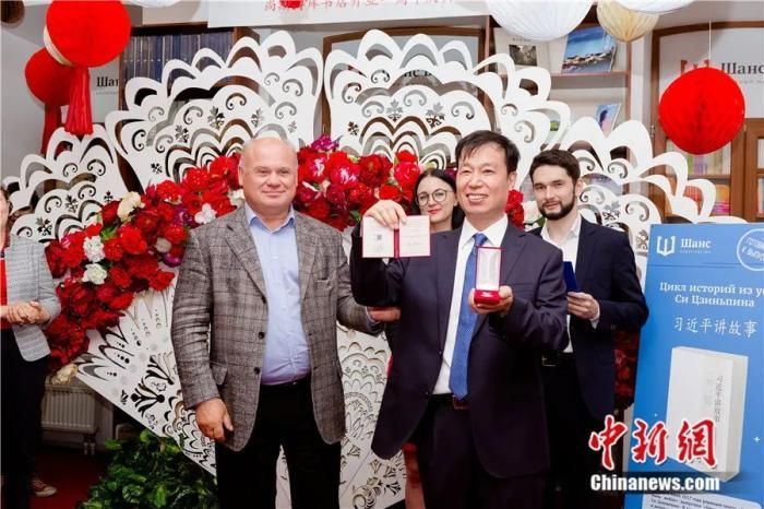 ▲2017年7月3日,俄罗斯全俄出版商协会主席康斯坦丁·车赤耶夫向穆平颁发杰出出版商奖章和证书。受访者供图