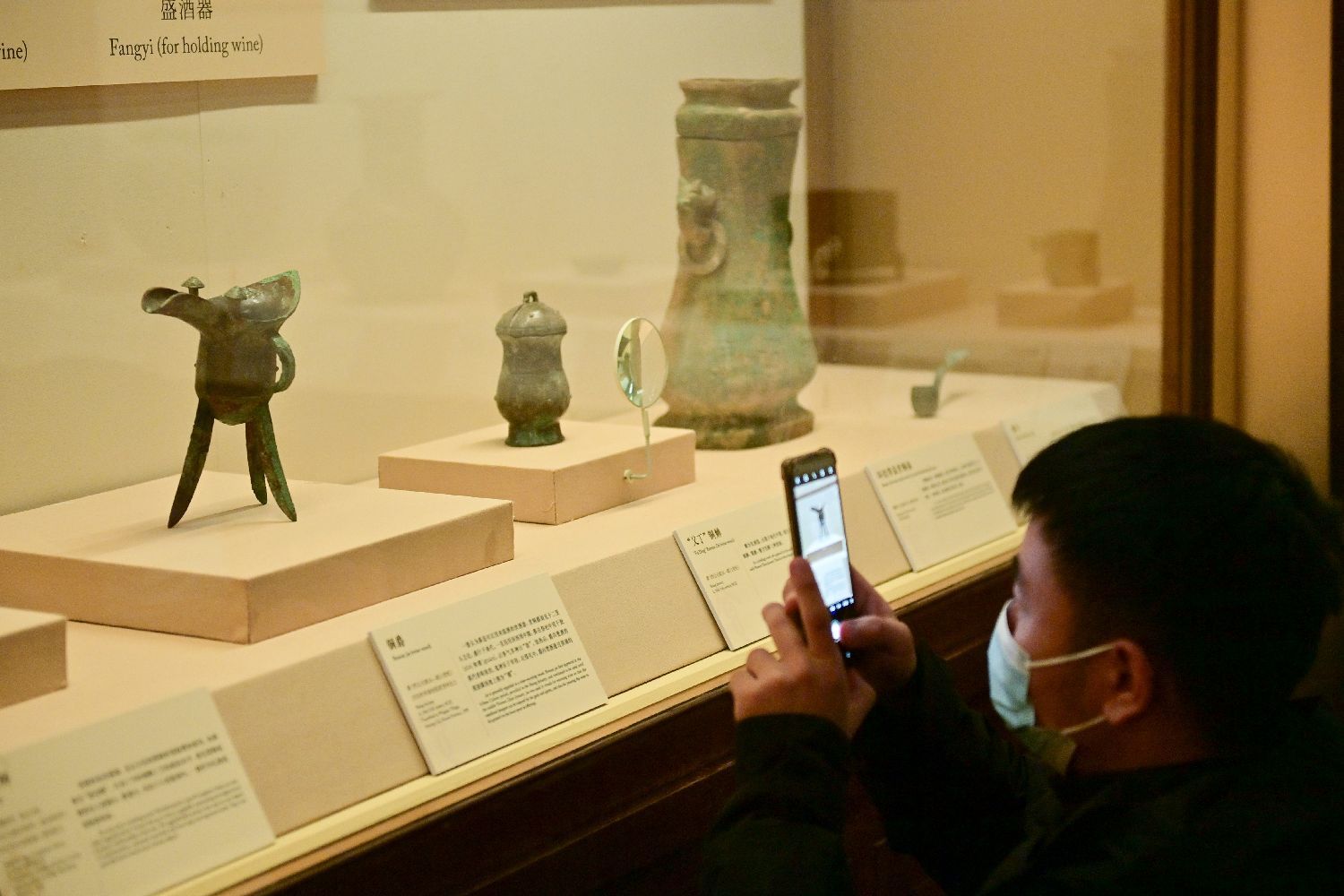 ▲中国国家博物馆“中国古代饮食文化展”上新并恢复对公众展出,参观者拍摄商代的饮酒器铜爵。(中新社资料图片 田雨昊摄)