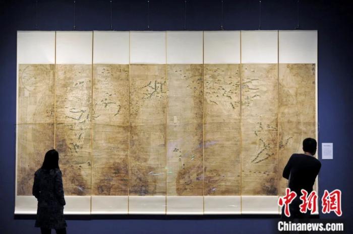 ▲观众在辽宁省博物馆欣赏由利玛窦绘制的《两仪玄览图》(仿制版)。孙昊声 摄