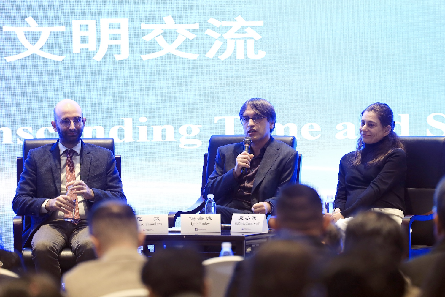 ▲北京语言大学博士后研究员范狄(DARIO FAMULARO,右三)围绕“跨越时空的文明交流”议题在论坛上发言。卞正锋 摄