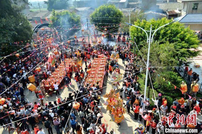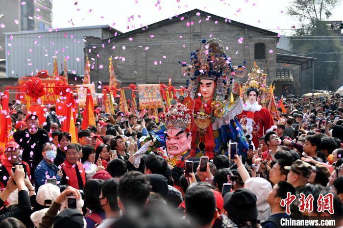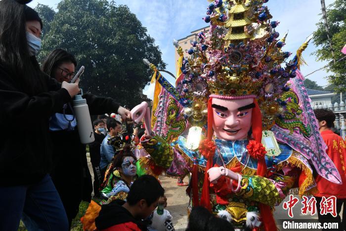 中新网福州2月19日电“咚咚咚……”19日上午,一阵阵锣鼓声从侨乡福建省福州市长乐区潭头镇厚福村传出,一场传统游神民俗活动在此举行,来自海内外的游客纷纷举起手机和相机拍照留影。