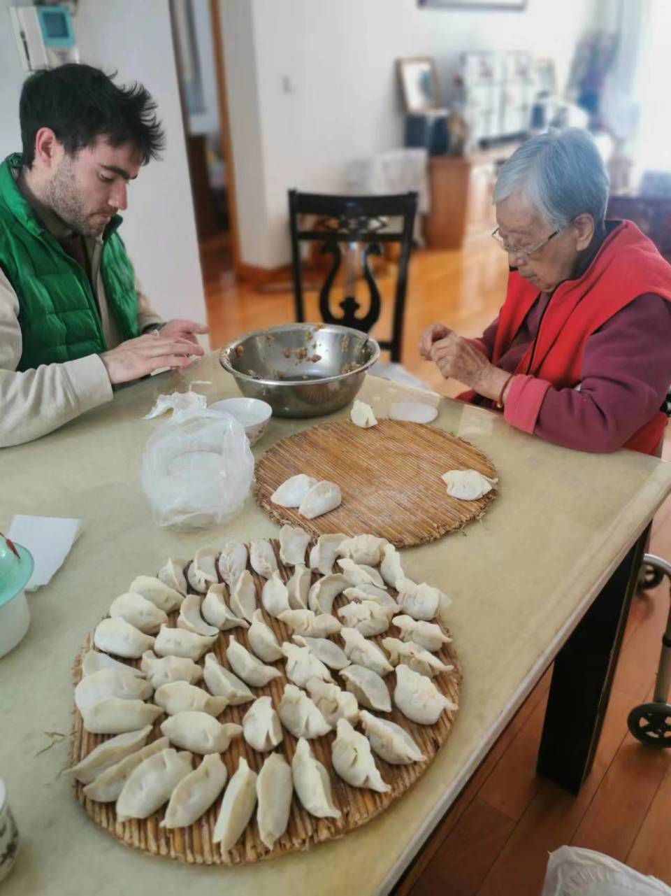 ▲文森和海漄的姥姥一起包饺子