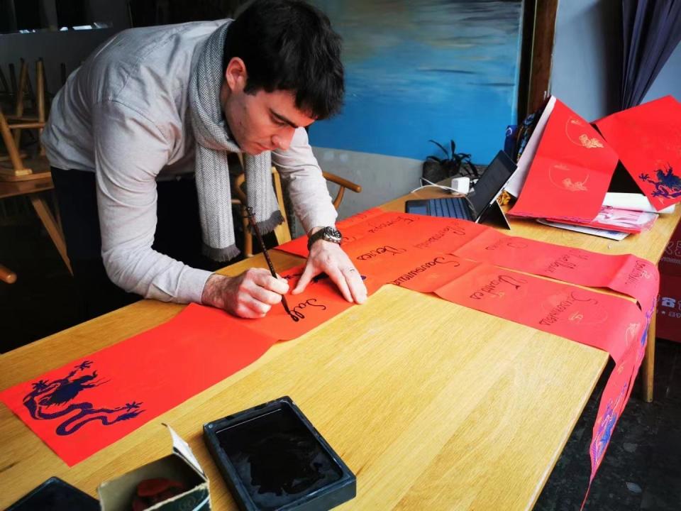 每年春节,文森和海漄都会写副春联贴在家门上,一个用法语、一个写中文。今年春节,文森的父母来到昆明看望儿子全家,父亲正在学中文,还认真地带着作业本。