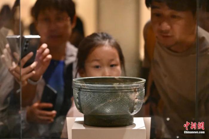 ▲2024年5月16日,国际博物馆日前夕,家长与小朋友在北京的中国国家博物馆观看展出的玉簋(商代)。田雨昊 摄
