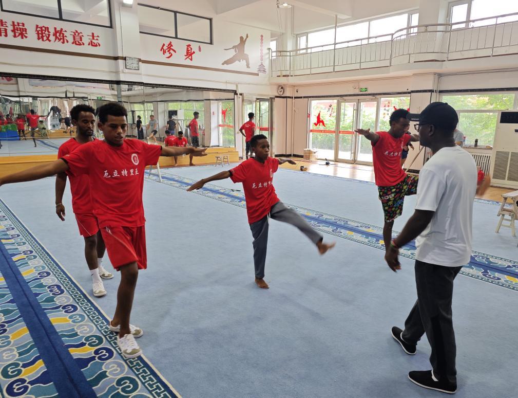 ▲8月14日,卡维塔(右一)带领厄立特里亚的学员练习踢腿。(图片来自新华社)