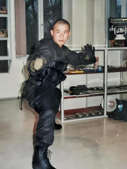 ▲2002年,王德庆在匈牙利国家警察局特警基地训练。(图片来自中新社)