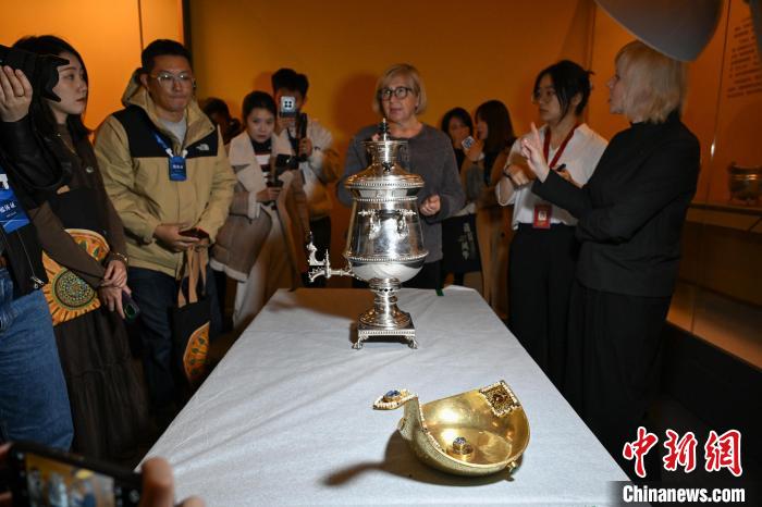 ▲俄方策展人为媒体介绍两件开箱文物。即将开幕的“俄宴风华——克里姆林宫博物馆藏饮食文物精品展”将展出138件(套)珍品。(图片来自中新网)