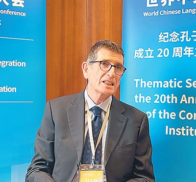 ▲日前在北京举办的2024世界中文大会期间,意大利汉学家、罗马大学孔子学院意方院长费德里科·马西尼接受媒体采访。