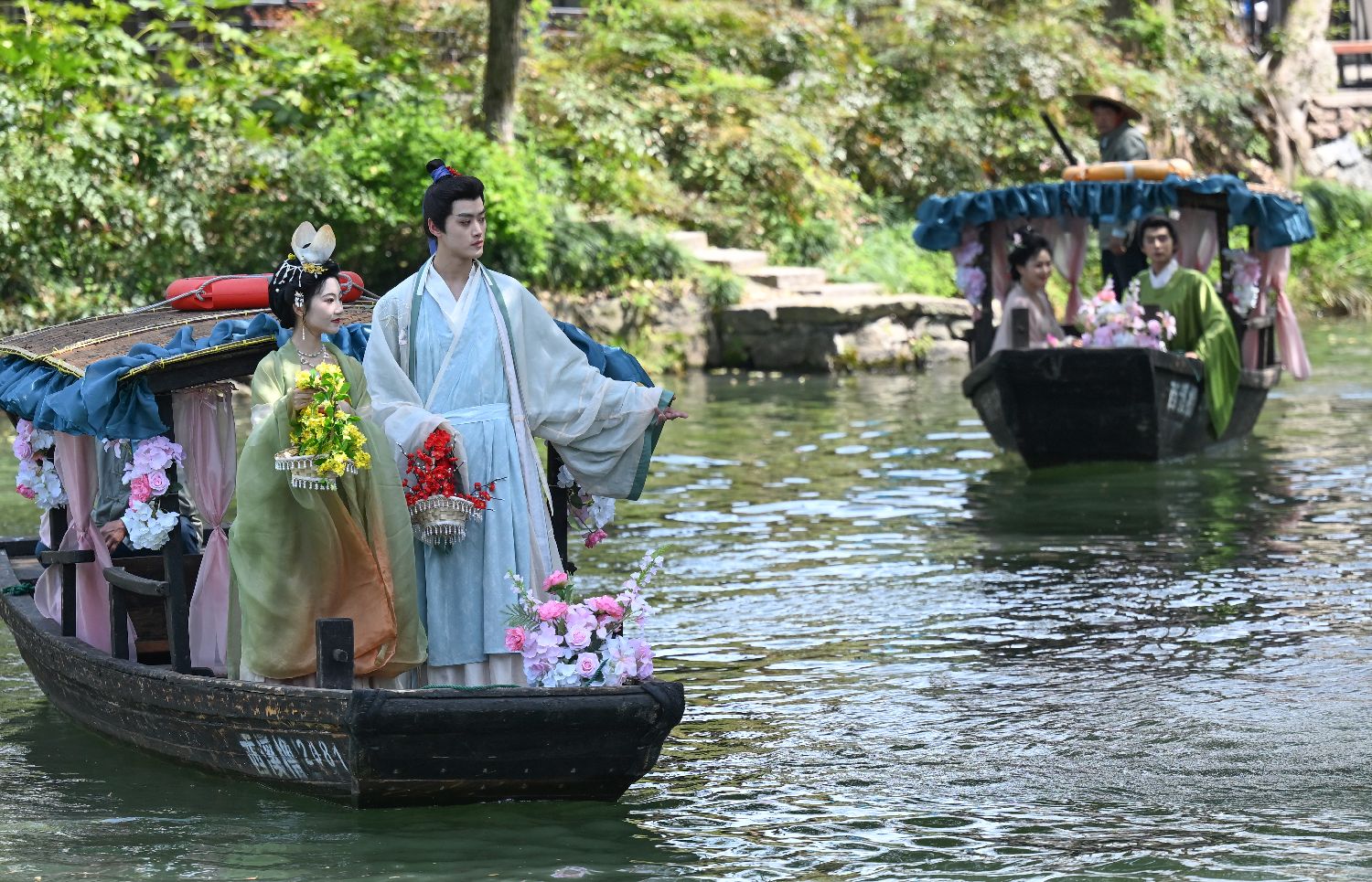 ▲3月24日,戏曲演员在繁花前表演。当日,“花朝杭州”春日行暨西溪花朝系列活动在浙江杭州西溪湿地启幕,“十二花神”水陆巡游呈现宋韵花朝节,缤纷烂漫的春日盛景吸引游客。(图片来自中新社)