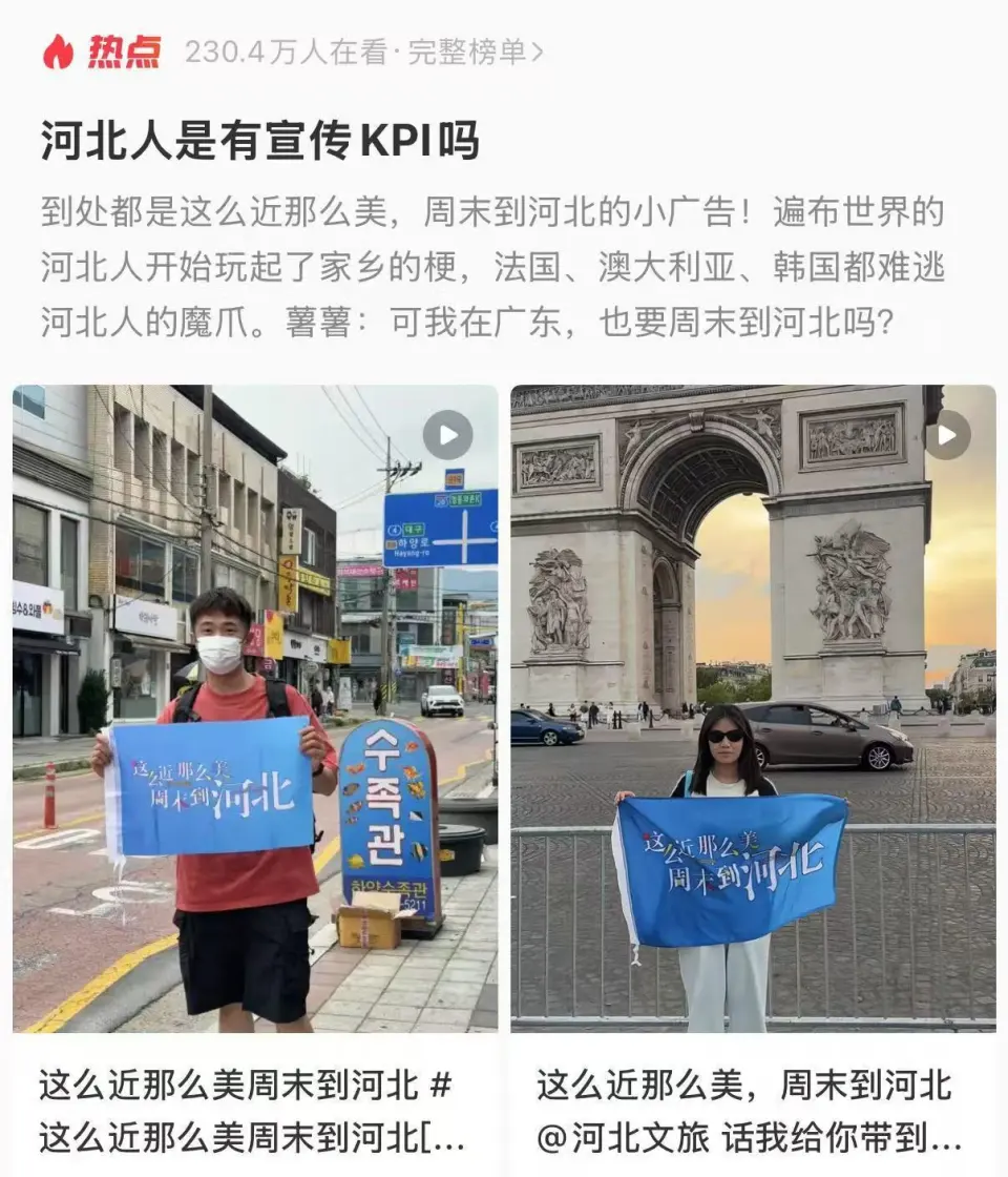 没有花哨的视觉包装,也不靠炫技的广告语,一面蓝色的旗帜配上响亮的slogan,高频刷新了河北的出镜率。别人出去旅游,不是打卡热门景点,就是排队网红餐厅;河北人出去旅行,火急火燎找到当地最火的地标,下一步小旗一掏,口号一喊,对着镜头就来上这句:“这么近,那么美,周末到河北”。