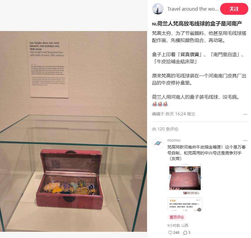 7月29日,一名网友发帖分享了自己发现,梵高美术馆中展出的一件梵高使用过的红色漆器盒子,在盒盖的内侧清晰可见一个印章写的是:“河南府。”