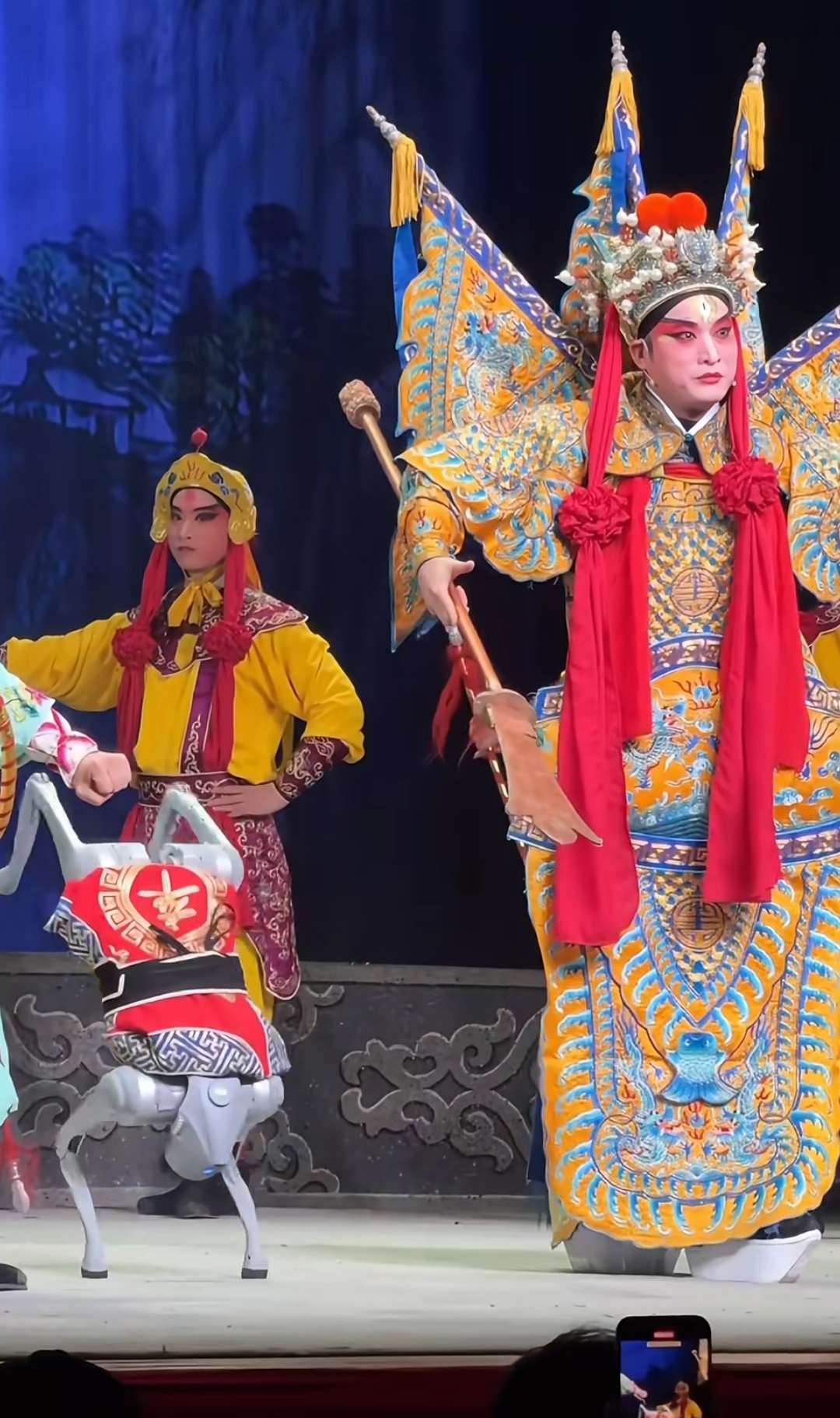 ▲浙江中月婺剧团演出中,让机器狗穿上戏服扮演哮天犬。图源短视频平台